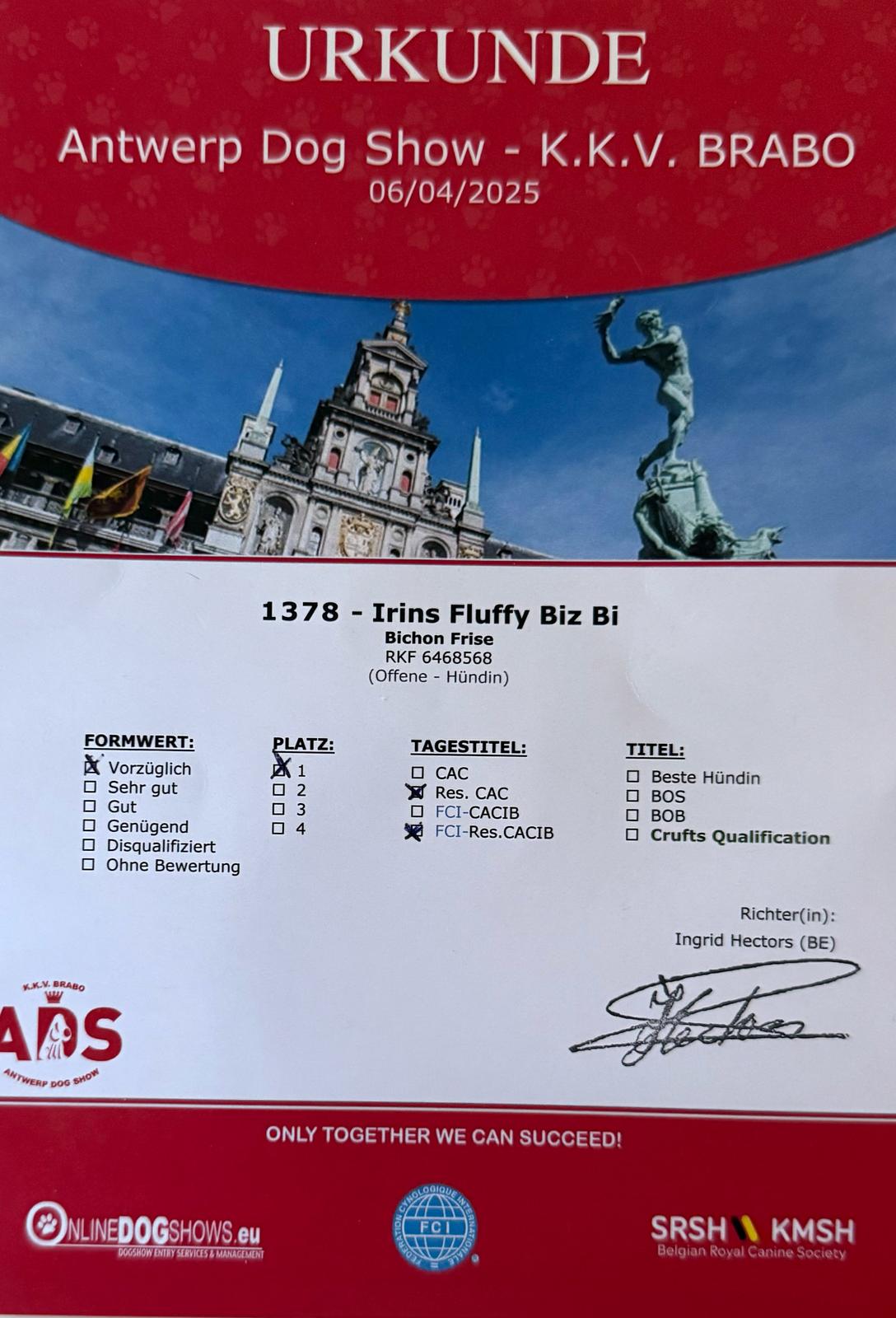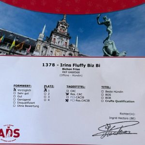 Sie erhielt ein Vorzüglich 1, im Stechen bekam sie das Reserve CAC und das FCI Reserve CACIB.