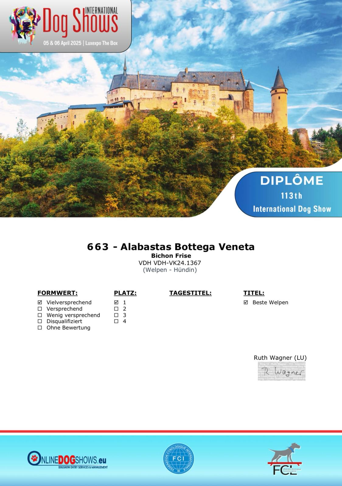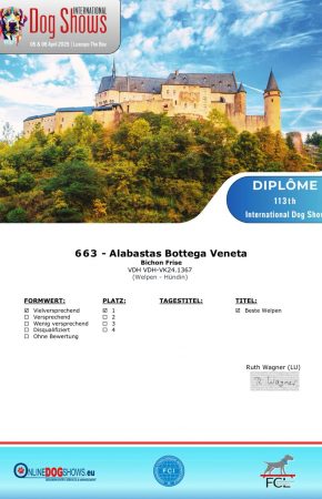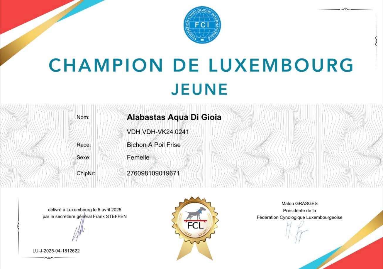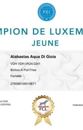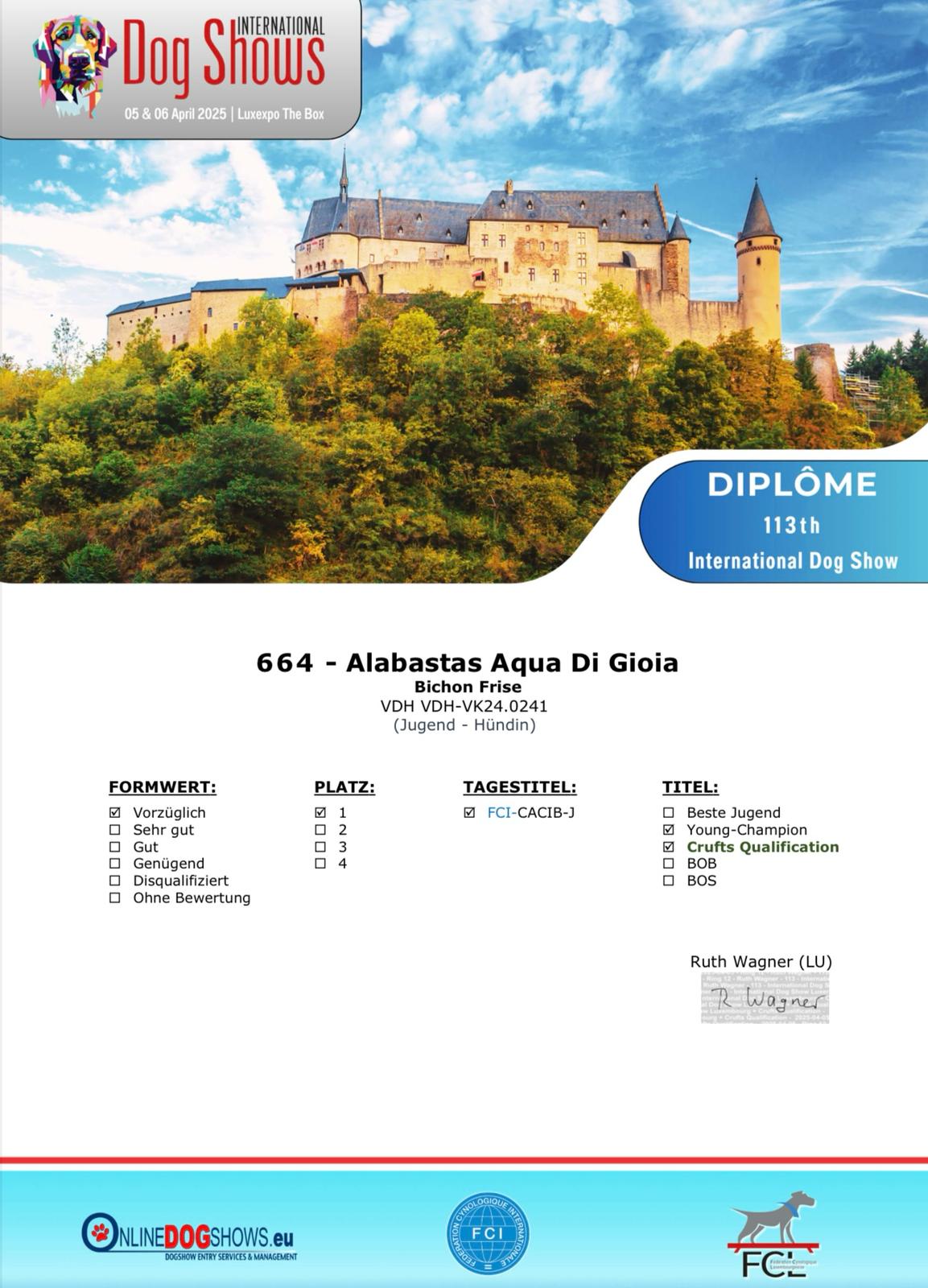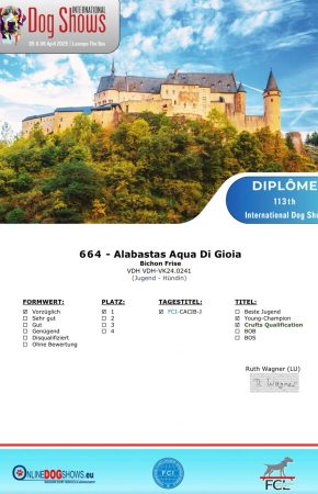 Hier startete Alabastas Aqua di Gioia. Mit etwas über einen Jahr alt lief sie perfekt und zeigte sich von Ihrer besten Seite. Gioia überzeugte die Richterin mit einem Vorzüglich 1, erhielt das FCI-CACIB-J, erlangte die Crufts Qualifikation und wurde Luxembourger Jugend Champion. Damit hat sie einen zweiten Jugendchampiontitel erreicht. Super gemacht kleine Gioia.