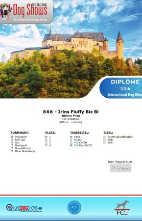 Hier zeigte sich Irins Fluffy Bizi Bi, unsere Lina. Souverän und mit Leichtigkeit präsentierte sie sich im Ring und erhielt ein Vorzüglich 1, das CACL und das FCI-Res. CACIB.