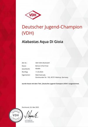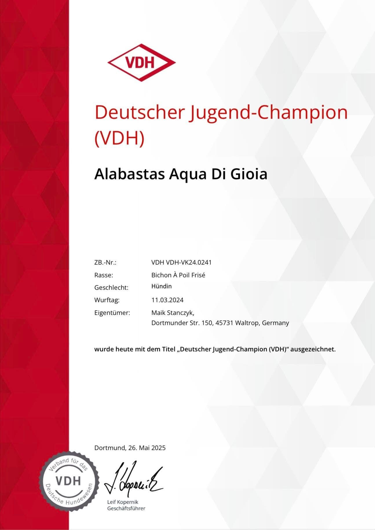 Sie darf den Titel Deutscher Jugend-Champion (VDH) tragen.